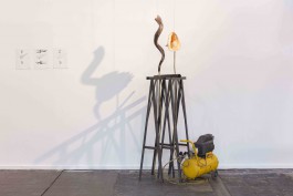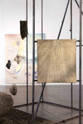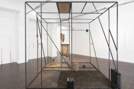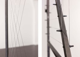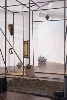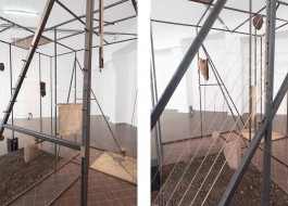 Eine begehbare Installation für akustische Interaktionen. Die Installation besteht aus einer Metallkonstruktion (300x300x280cm), die mit einer rechteckigen Trommel aus Ziegenhaut, verschiedenen Klavier- und Darmsaiten ausgestattet ist, die teilweise mit natürlichen Objekten wie Steinen, Holz, Metall und Erden auf dem Boden befestigt sind. Die gesamte Konstruktion ist über Piezo-Mikrofone mit einem Audiosystem verbunden, das die Spannungen und Schwingungen im Material, die bei der Interaktion mit den Elementen der Konstruktion entstehen, hörbar macht.